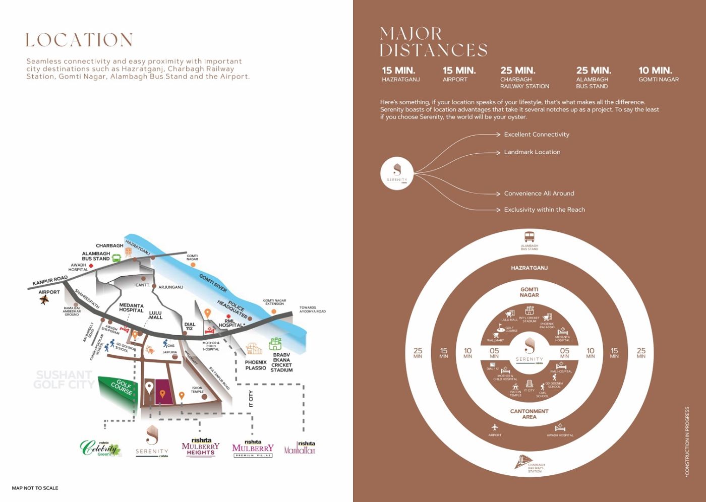 Rishita Serenity Lucknow offers a coveted address in the heart of Sushant Golf City, Lucknow, placing residents near key landmarks like Medanta Hospital, Ekana Cricket Stadium, Lulu Mall, and Walmart Best Price. This prime location ensures unmatched convenience.